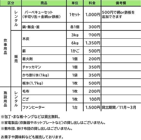 | レンタル可能用品 | あり 鍋、フライパン、飯盒、BBQセット(木炭、薪等は別) ※当日受付にてお申し付けください。