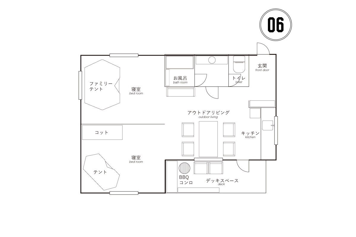 「一度は体験してみたいテント泊」を、気軽にできるアウトドアの秘密基地。準備や片付けが不要で、ゆっくりと家族や仲間と有意義な時間を過ごせます。おすすめは、部屋の照明を落として、ランタン灯りで過ごすこと。柔らかな灯りがお食事、テント泊をキャンプ体験へと変えていきます。夕食はデッキスペースのBBQで最高のアウトドア体験を。
