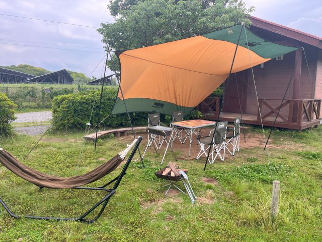 設備:屋根付きウッドデッキ、屋外ポーチライト、テント・タープ設置スペース(6m×9m)